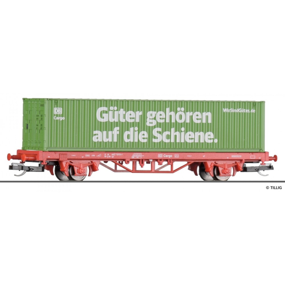 Vagon platforma incarcat cu un container de 40', tip Lgs, cuple NEM 358 cu cinematica KK, lungime 117 mm, DB Cargo, ep.VI, scara TT.