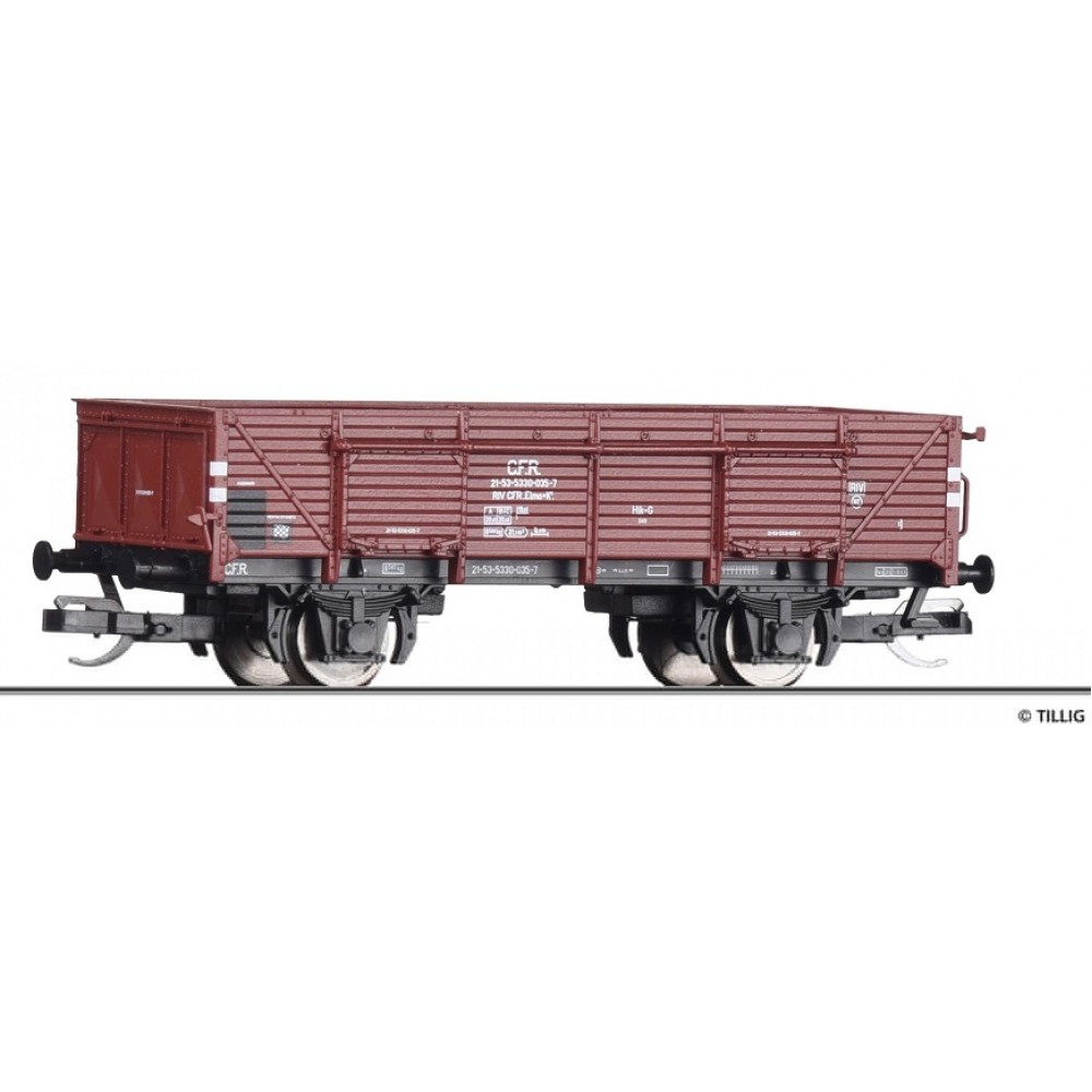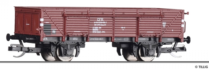 Vagon gondola pe 2 osii, tip Elmo, cuple NEM 358 cu cinematica KK, lungime 76 mm, CFR, ep.IV, scara TT / 1:120 / 12 mm ecartament.