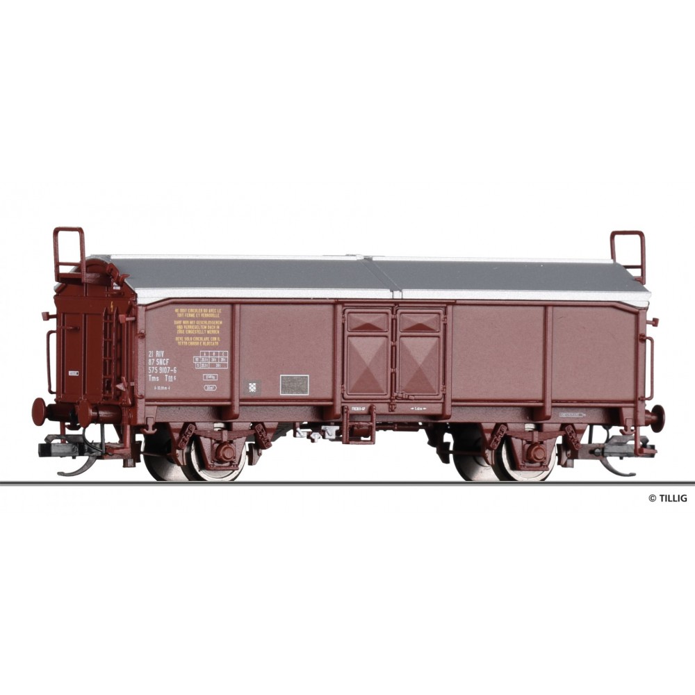 Vagon marfa cu acoperis culisant, pe 2 osii, tip Tms, cuple NEM 358 cu cinematica KK, lungime 84 mm, SNCF, ep.IV, scara TT / 1:120 / 12 mm ecartament.