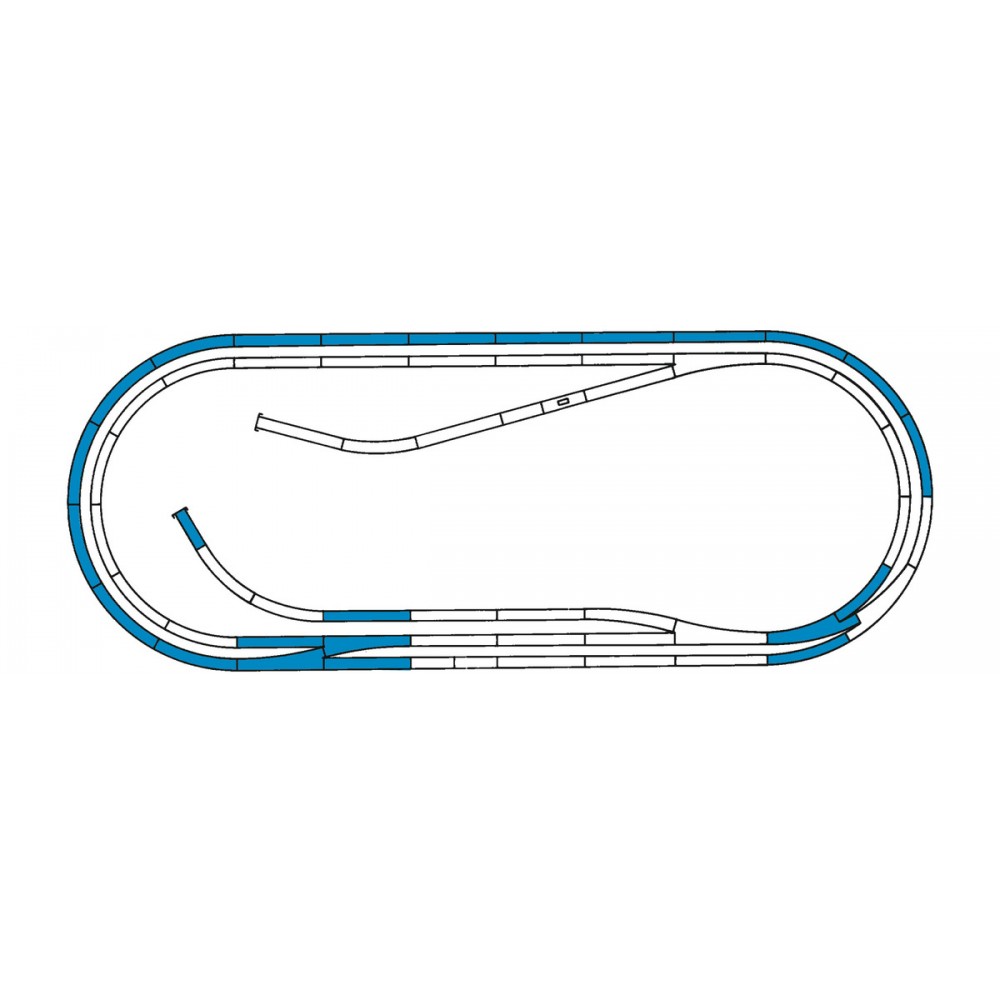 Set de extensie D de sine Roco Line ( cu terasament flexibil de cauciuc ), scara H0 / 1:87 / ecartament 16,5 mm. Setul inlocuieste setul 42012 si contine macaze revizuite.