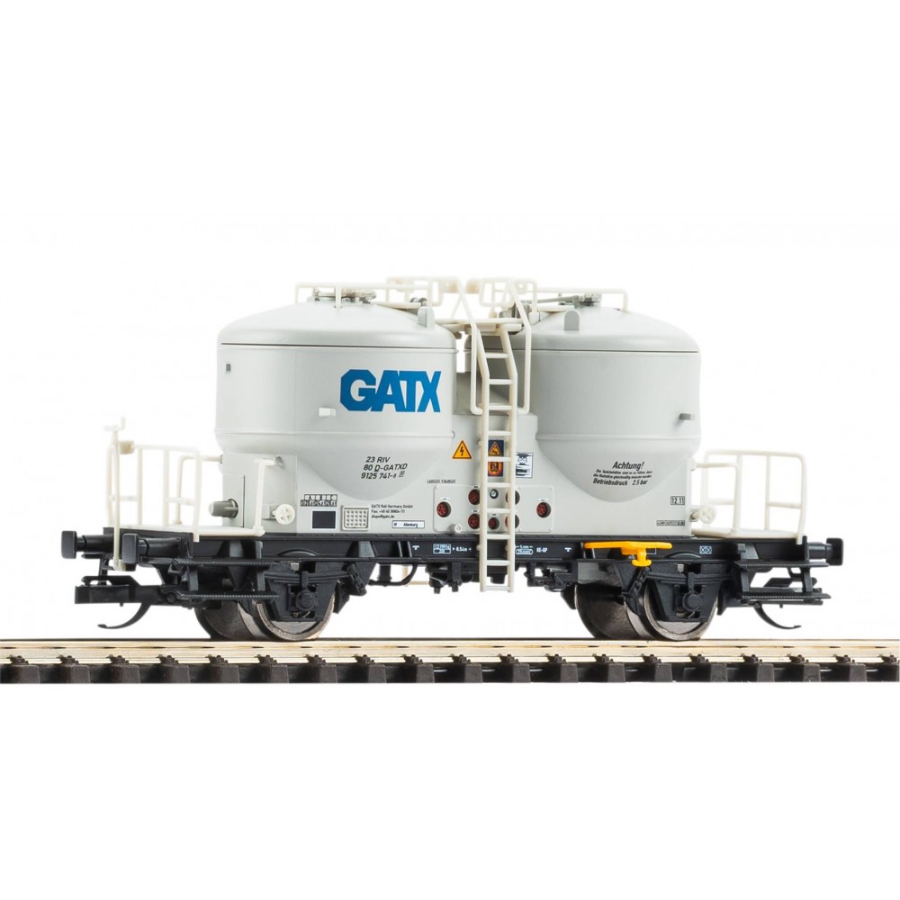 Model de vagon siloz pentru transportul marfurilor pulverulente (ciment), inscriptionat "GATX", cuple NEM 358 cu culise pentru cuplarea apropiata si cuple scurte montate, lungime 77 mm, raza minima recomandata 287 mm, GATX, ep.V, scara TT / 1:120 / 12 mm ecartament.
