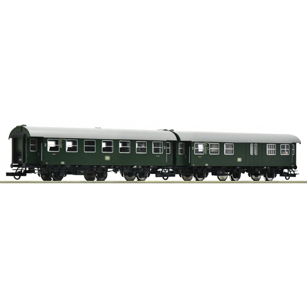 Set de 2 vagoane pentru tren local DB - H0 Roco 6200039 , ep.III, scara H0 / 1:87, 310 mm lungime totala garnitura, osii izolate pe o parte, culise si cuple scurte Roco montate la toate vagoanele dar si cuple standard prezente pentru toate vagoanele. Setul este compus din : un vagon de clasa 2 de tip B3yge si unul de clasa 2 si compartiment de bagaje BD3yg.