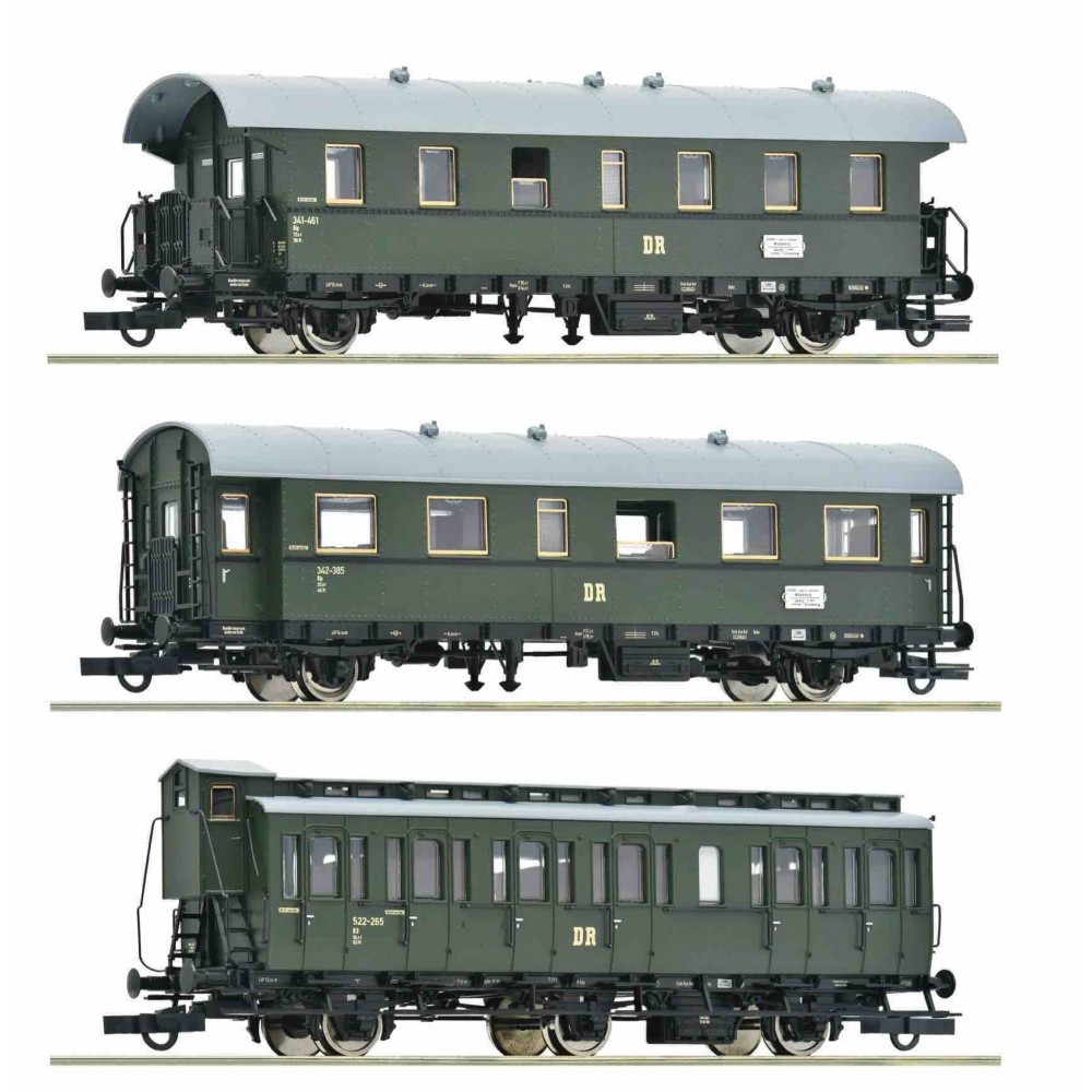 Set de 3 vagoane pe 2 si 3 osii, DR, ep. III, 466 lungime garnitura, culise cu cuple scurte Roco montate, scara H0 / 1:87 / 16,5 mm ecartament.