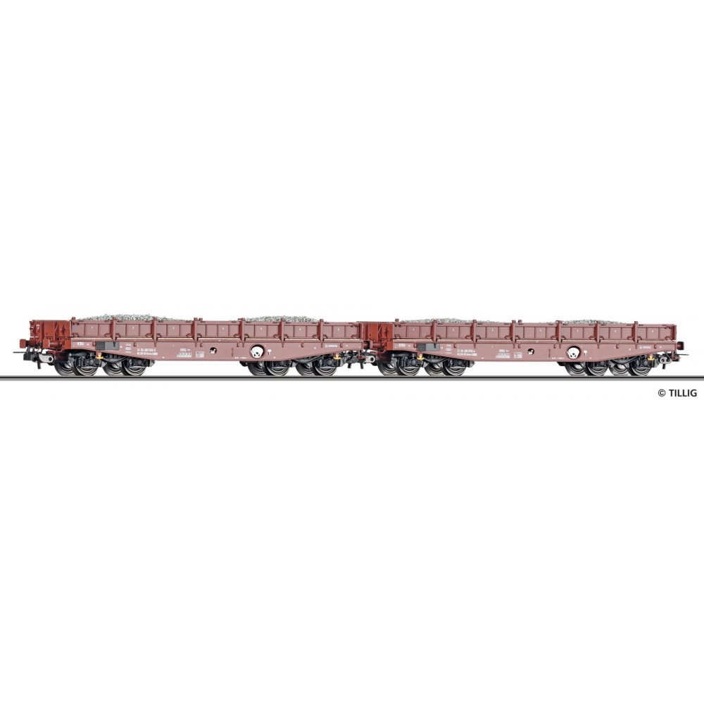 Set de 2 vagoane platforma de tip Rmms 3960 incarcate cu pietris ,cuple NEM 362 cu cinematica KK ( culise si cuple standard montate) , lungime totala 219 mm, DR, ep.IV, scara H0 / 1:87.