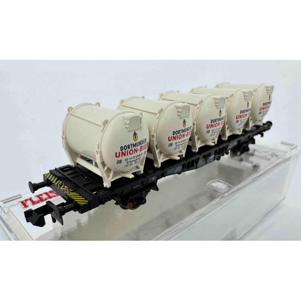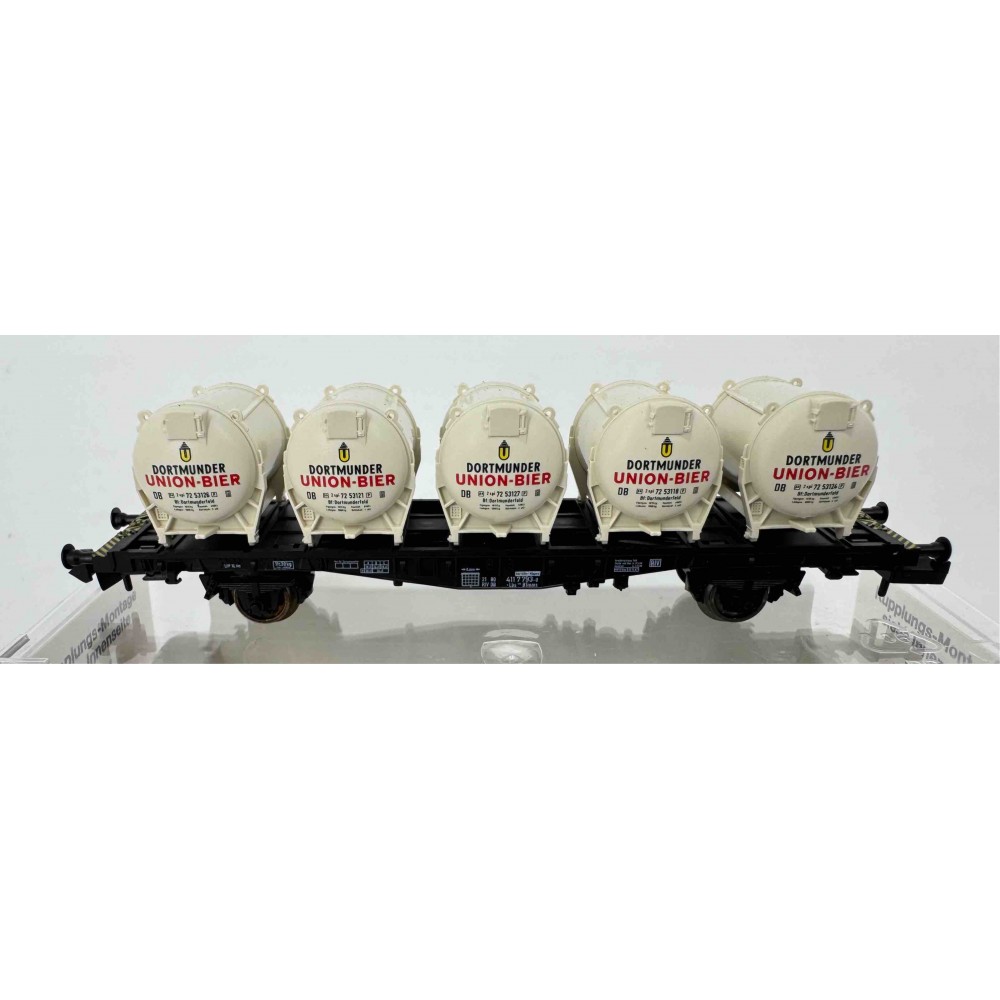 Vagon cu platforma de tip Lbs 598, incarcat cu 5 butoaie de bere "Dortmunder Union-Beer" , DB, ep.IV, 90 mm lungime, scara N / 1:160 / 9 mm ecartament.