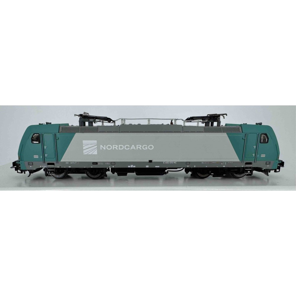 Locomotiva electrica E. 484.010 - Nordcargo, motor cu volanta, interfata pentru decodor cu 8 pini, 2 inele de aderenta, lumini directionale albe si rosii cu led, lungime : 217 mm, scara H0 / ecartament 16,5 mm, model Digital - DCC ( decodor cu 8 pini TOM montat ), raza minima recomandata : 358 mm .