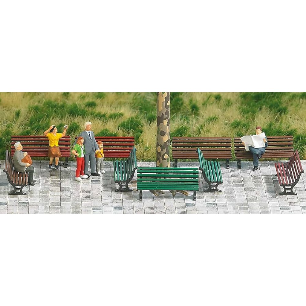Set de banci pentru parc sau gara, scara H0 / 1:87. Setul contine 12 banci de diferite culori.
