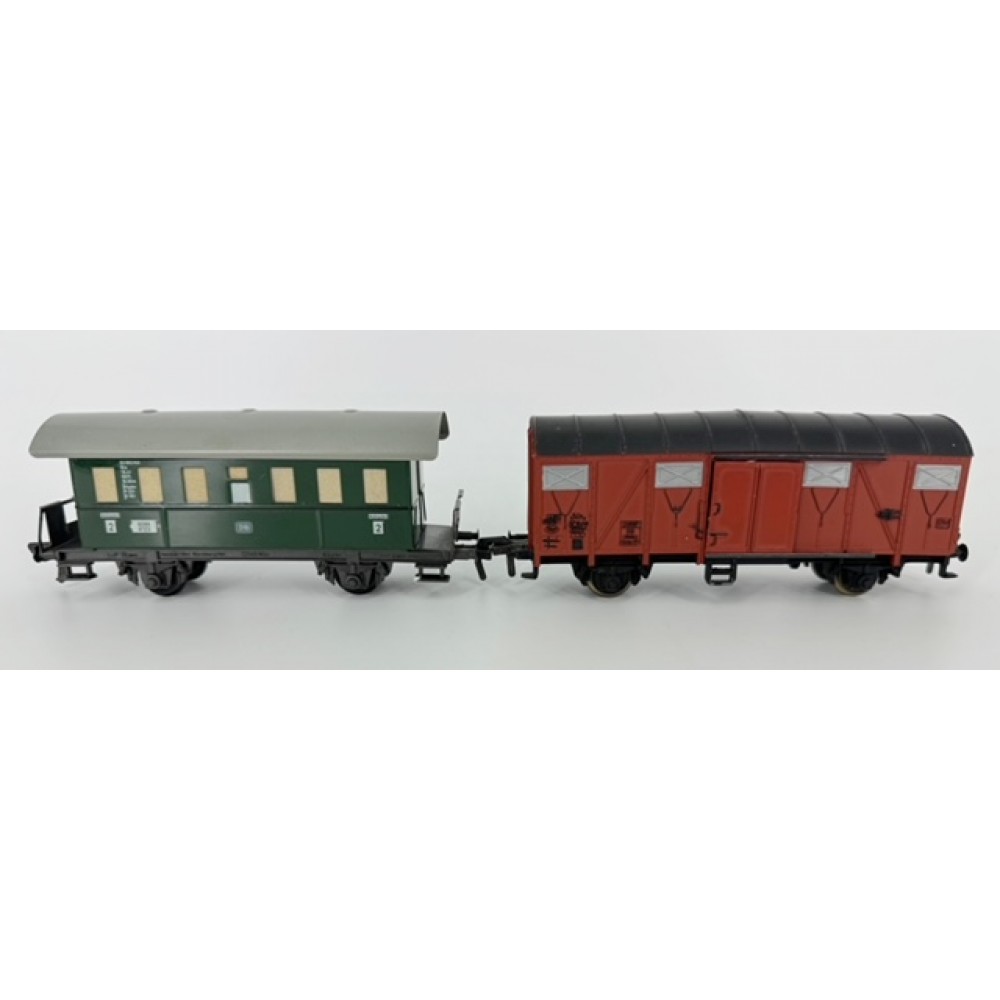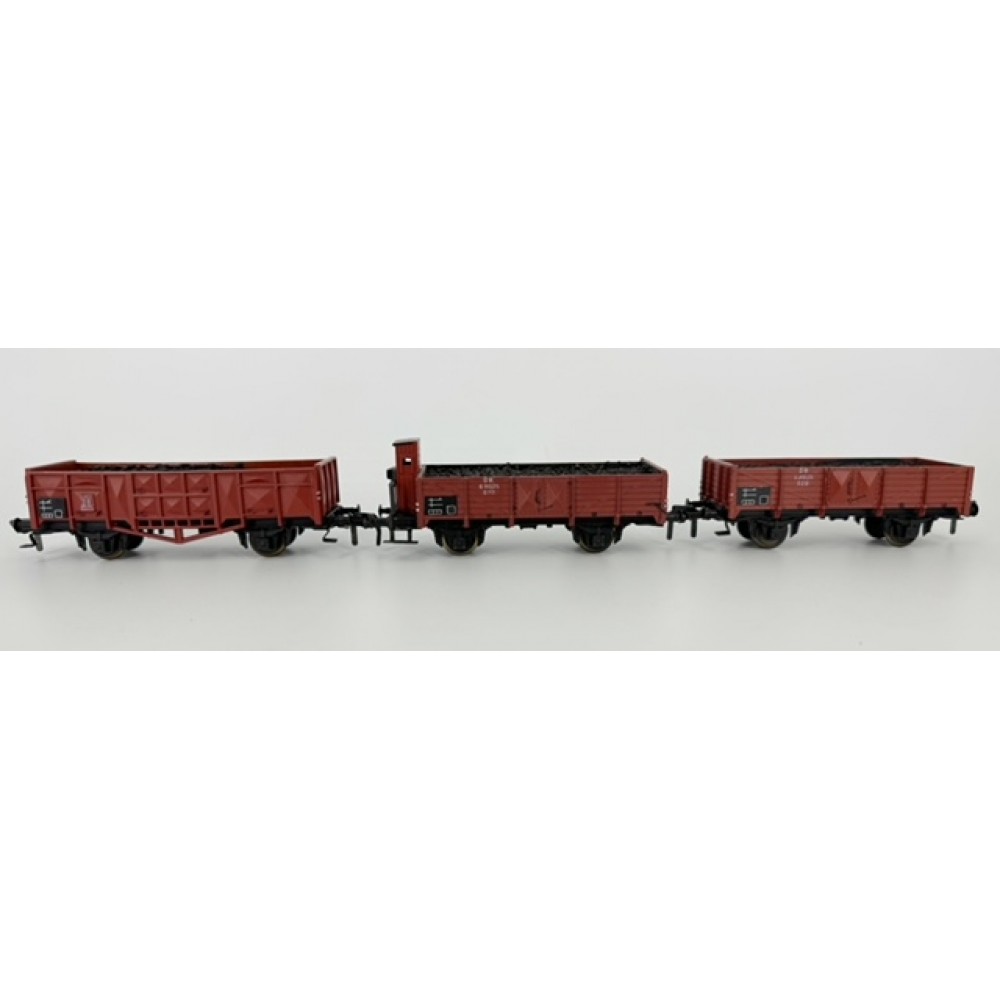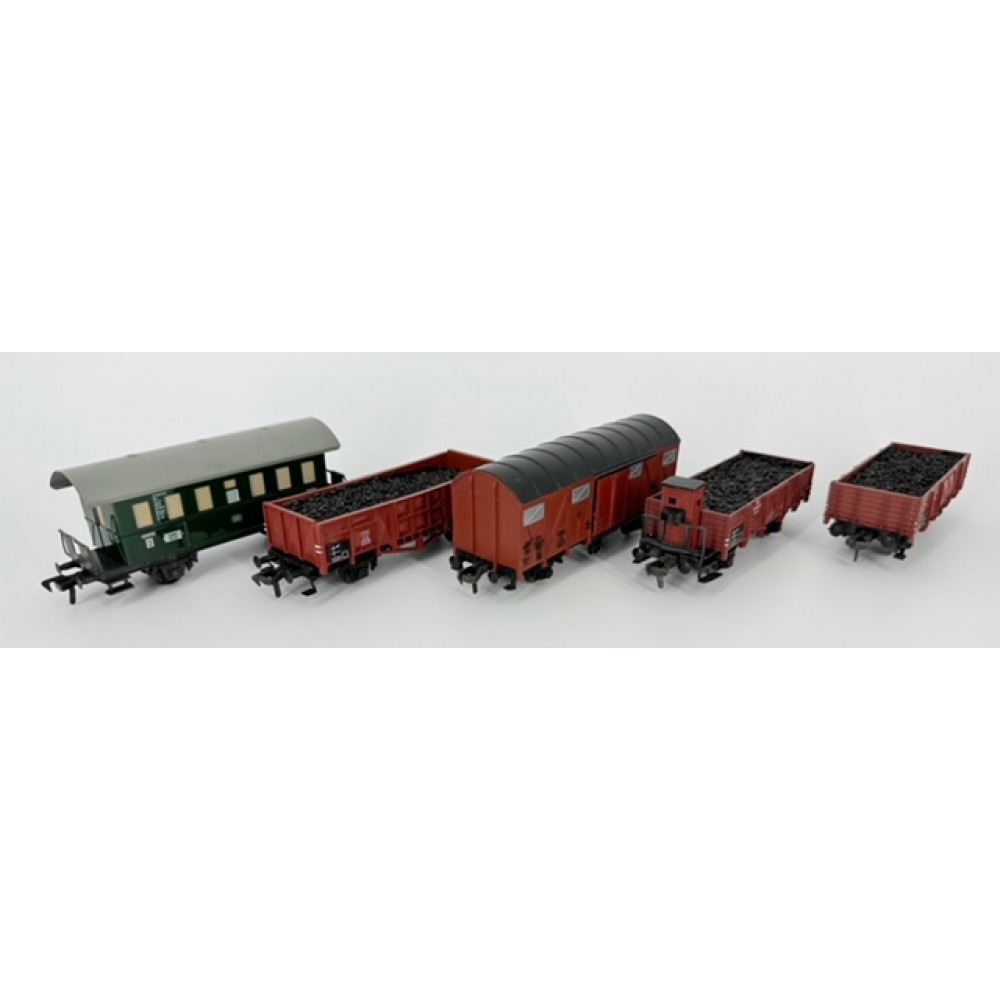Set tren mixt vintage DB, scara H0, producator : Fleischmann. Codurile vagoanelor sunt : 5000, 5023, 5330, 1454 si 1485,gondolele au incarcatura de carbune iar vagonul inchis are usi culisante, toate vagoanele sunt echipate cu cuple Fleischmann model vechi si nu se pot schimba, in set veti gasi 4 bucati cuple Fleischmann de acelasi model dar pentru portcupla universala prin care se vor putea cupla cu alte tipuri de vagoane.
