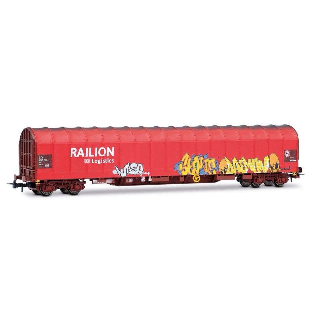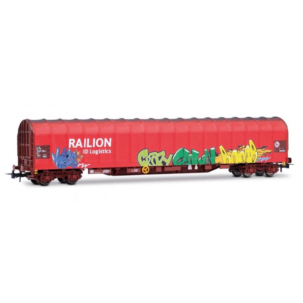 Vagon acoperit cu prelata si cu grafitti, DB AG - Railion DB Logistics, ep.V-VI, scara H0 / 1:87, culise si cuple standard montate, 227 mm lungime.