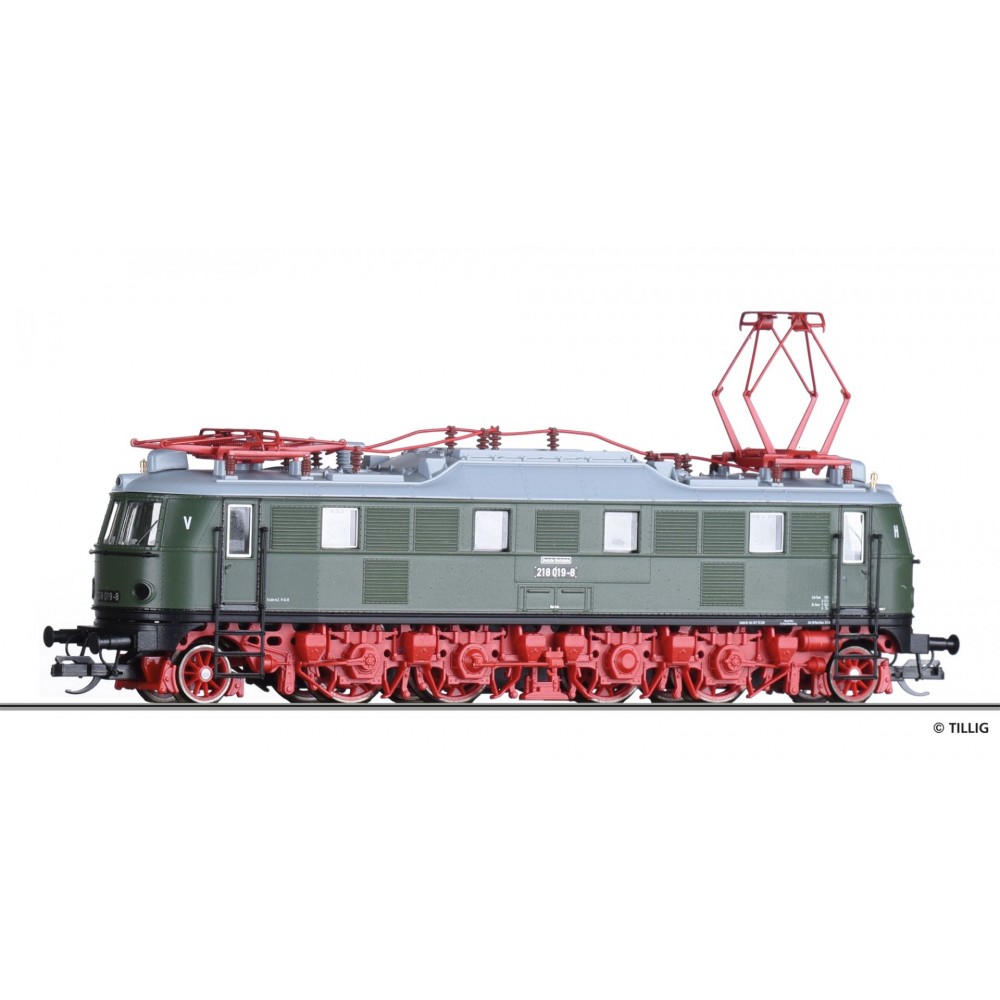 Locomotiva electrica seria 218 DR, ep.IV, motor cu volanta, tractiune pe 4 osii,2 inele de aderenta, interfata pentru decodor Plux12 ( NEM 658 ), faruri directionale albe, culise pentru cuplare apropiata ( NEM 355 ) 141 mm lungime, scara TT / 1:120 / 12 mm ecartament, raza minima recomanda R310, model analog ( DC ).