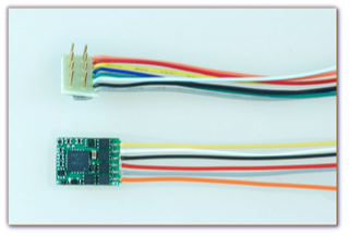 Decodor digital Kuehn NEM 652, cod 82320, model N45-8P - 8 pini. Dimensiuni : 8,9 x 11,7 x 2,3 mm , lungime cablu aprox. 90 mm. Curent maxim pe motor 800mA, 4 iesiri de 200mA fiecare.