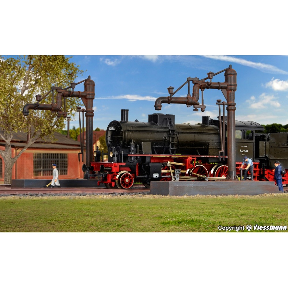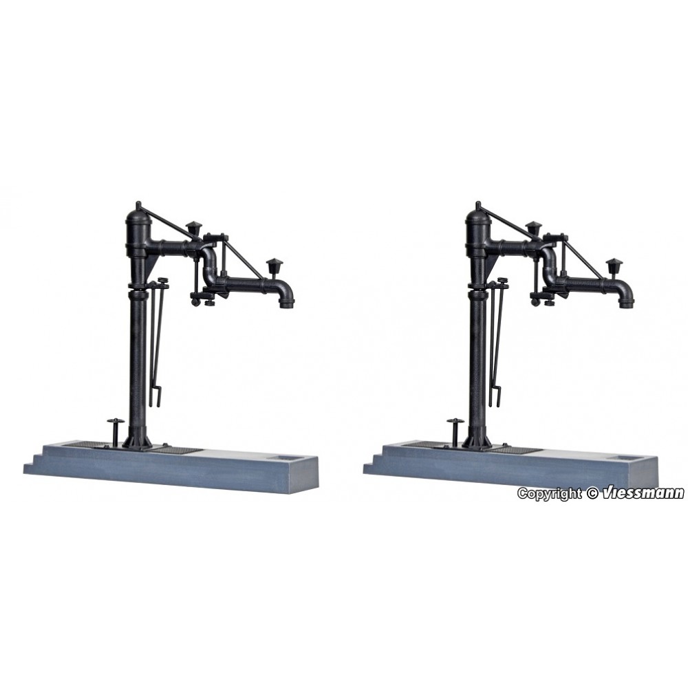 Pompe alimentare cu apa a locomotivelor cu aburi - scara H0 .Dimensiuni montaj : 8,5 x 2 x 8 cm . Kit-ul contine 2 pompe . Se utilizeaza adeziv pentru montaj.